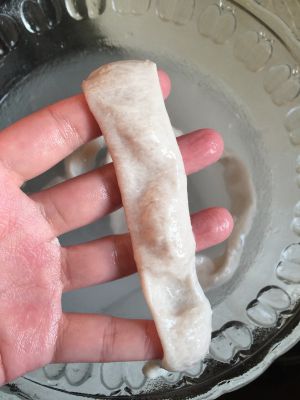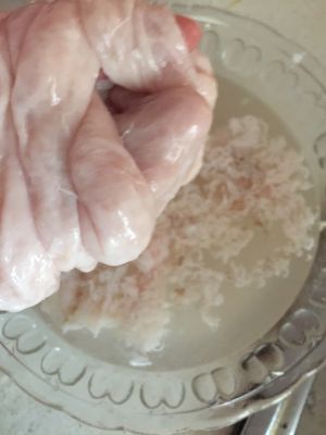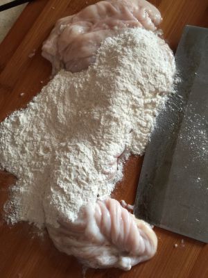 撒上玉米淀粉,用手将大肠里面的薄皮搓下来。