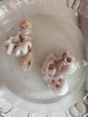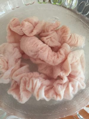 大肠用水冲洗下,用筷子将里面翻过来,把里面的肥脂肪摘掉用水冲洗干净