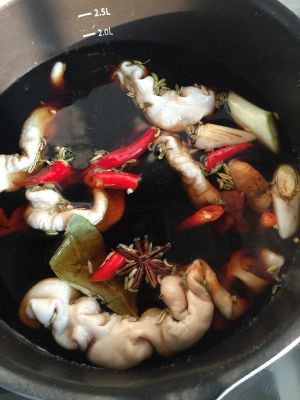在准备一锅清水,将洗净的大肠放入锅内。将准备好的材料放入锅内。再倒入适量的生抽、老抽、料酒和少量白糖(提鲜用)盖上锅盖卤煮30分钟左右就可以了哈
