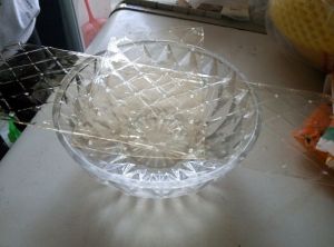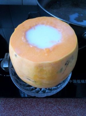 晾凉后装入木瓜内,木瓜坐在碗里,封上保鲜膜,冷藏