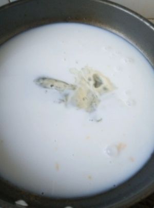 放入泡软的吉利丁片,一直熬到融化后,闭火晾凉