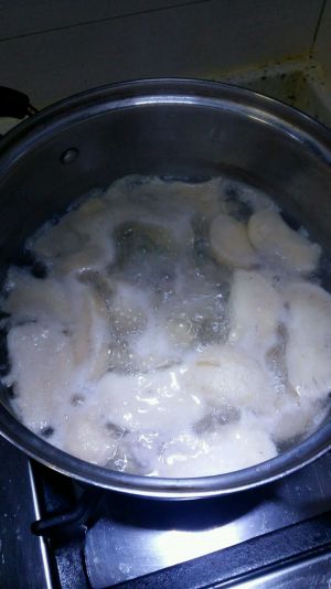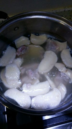 用白蘑菇最好,我就地取材用了楼下的新鲜猴头菇,漂洗,切片,下白水煮,然后开始兔肉改条。