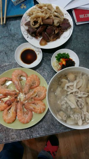 白灼虾无需介绍,加料酒、生姜水煮三分钟,冷水激,摆盘,生抽配盘,鲜无比