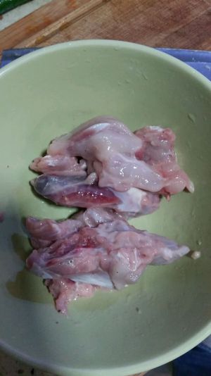 兔肉切好条,摆碗,放姜片、胡椒、酸片、料酒码味,切记红薯粉、盐巴、白糖、鸡蛋清半个,下锅前再放,否则肉汁溢出不再鲜嫩。所有需要芡粉的食材,都在入锅前调制!