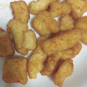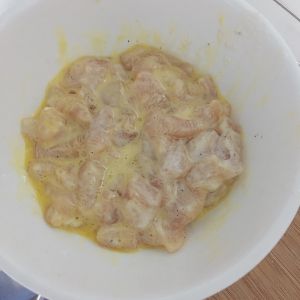 ding~接下来将刚刚腌制的鸡肉放进过筛的淀粉内,抓匀后再将鸡肉倒进鸡蛋黄中,抓匀。
