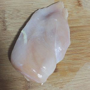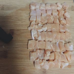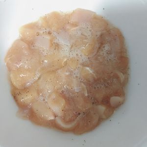 把块状鸡肉放入碗中,加入蛋清、盐、胡椒粉、椒盐,腌制15-20分钟。