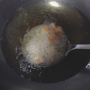 倒一半锅的油,烧热(用筷子伸进油锅内有小气泡就行),接着把鸡肉放在网筛内油炸,炸至表面金黄即可。