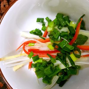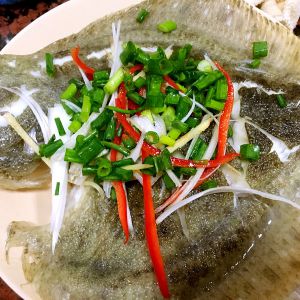 开水上锅蒸鱼八分钟,蒸好后将盘子里多余的蒸汽水倒掉,再将刚刚切好的调料放在鱼面上,取干净锅放入20克左右的油烧热,浇在调料上。