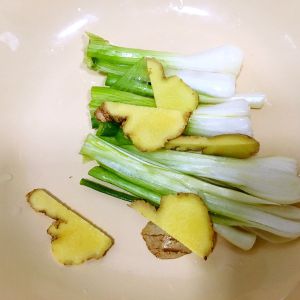 姜片,葱白,放在盘子底部,然后将腌制好的鱼盖在上面。