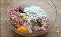 将剁好的猪肉置于碗中,加入两大勺生粉,一小勺盐,一小勺鸡精,小半勺胡椒粉,半勺老抽,一个鸡蛋,姜末少许,10ML水,搅拌均匀;