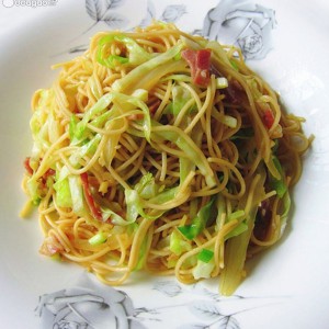 再加入切好的圆白菜丝,翻炒到圆白菜和洋葱稍微软榻,这时放入用香油拌好的面条继续炒。