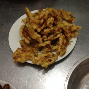 把淀粉加水弄匀。肉切片用淀粉抓匀。 锅中放油。油开。 把用淀粉包裹的肉放入锅中油炸。炸金黄色捞出。