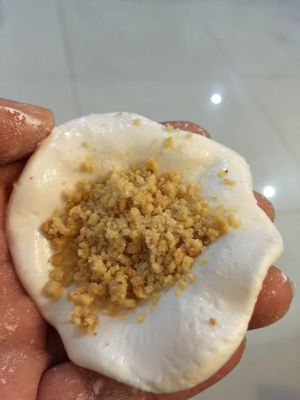 糯米团分好压扁,将馅放中间包好