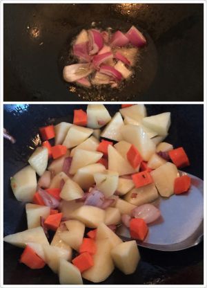 热油,洋葱焙出香味后,加土豆胡萝卜翻炒