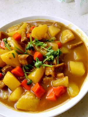 十分钟左右,土豆烂了,随心意撒上香菜即可出锅,出锅前可加入少许生抽调味,注意,我全程没有放盐,咖喱用的是超市常见的百梦多,不辣的那种,咸度足够了。