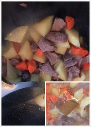 土豆胡萝卜断生后加入炖好的牛肉翻炒,加两勺牛肉汤一碗开水没过牛肉,加入两块咖喱,用勺将咖喱搅拌化开后,盖上锅盖,焖大约十分钟
