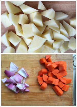 炖牛肉时,土豆切滚刀丁,洋葱胡萝卜切丁备用。