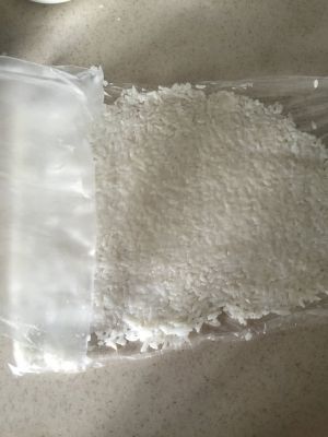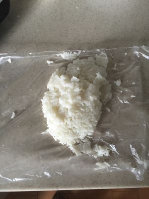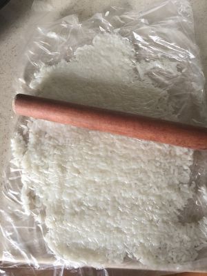 用刀子割开保鲜袋,将米饭夹在保鲜袋中间
