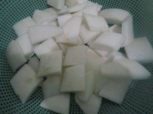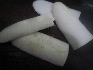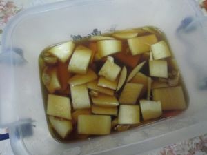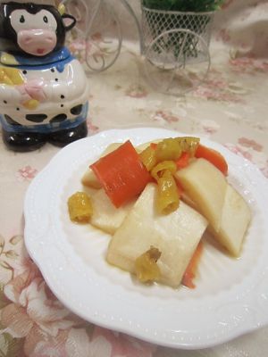 把泡椒切碎,里面的那个泡椒水也一起倒进去,放入生抽,陈醋,姜,再把切好的萝卜皮放进去