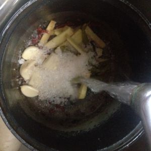 把准备好的佐料一起放入锅中加水,再加一勺盐和一勺白糖煮沸!