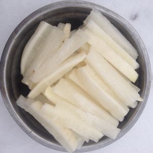 先把白萝卜洗干净,切成指头般粗细长短。连皮一起切,不要浪费!