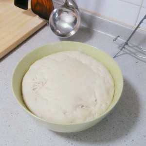 放在室内暖和的地方,用麻布盖上(麻布要用水浸透拧到不滴水),等待发酵,直到发现现在的面团是最初面团2倍,即可使用。我的图片是发酵好的。嘻嘻~