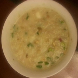 熬的差不多了关火,撒点葱花,细盐,注意,重点来了,倒一点点色拉油或者橄榄油,和匀。一碗绝品皮蛋瘦肉粥就出品了。
