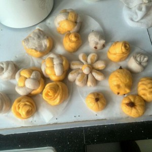 南瓜蒸熟压成泥和面粉酵母,糖放一起,和和面团,紫甘蓝和面粉,酵母糖放一起合成面团,发酵至2倍大。
