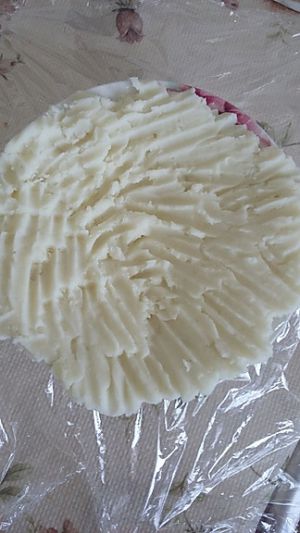 准备好一个浅口的碟子,上面铺上一层保鲜膜,把山药泥均匀的铺在保鲜膜上