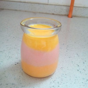煮沸的牛奶倒入布丁粉,搅拌均匀,倒入布丁瓶,大概三分之一,因为做的是彩虹的,这层我放了哈密瓜味的,放入冰箱冷藏到凝固