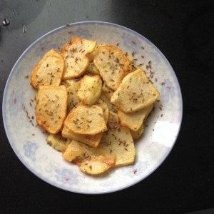切土豆片,下锅炸,炸至金黄捞出加盐孜然