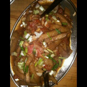 炒锅中加油,以淹没茄子为准.煎炸茄子变软后捞出