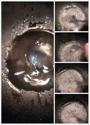 用少量水,把白糖放入水中,用勺不停的搅拌,看到泡泡越来越多,发白状就可以了!准备把花生入锅了!记得小火熬糖哦!