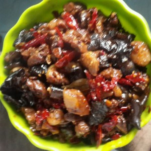 菜籽油8成热 下鸡肉扁炒下 比较干了然后捞起