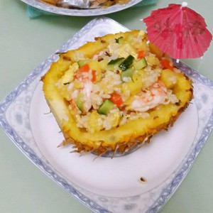 重新启锅,放油,把之前减下来的虾头倒进油锅煸出虾油,放入葱末爆香,倒入胡萝卜,炒胡萝卜的空可以把虾头挑出来。然后放入米饭,煸炒一会放入鲜虾,虾变色后倒入菠萝,炒好的鸡蛋,米饭炒至米粒成单颗并且米粒饱满,放盐调味,