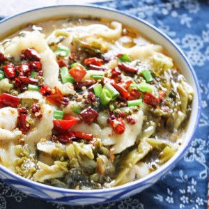 锅内放入底油爆香葱姜,干辣椒段,放入鱼头鱼骨添汤炖,放入豆芽,豆腐,酸菜,煮开后5分钟捞入碗中,把鱼片一片片放入汤中,颜色发白后连汤一起盛出。