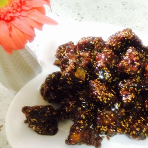 将炸后油倒出,留40毫升左右,用最小火,加红糖,不停搅拌至起丝状,加醋拌匀,加排骨炒一分钟,最后加芝麻起锅即可!