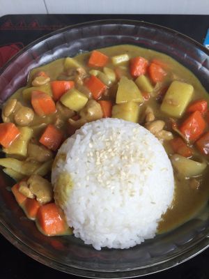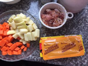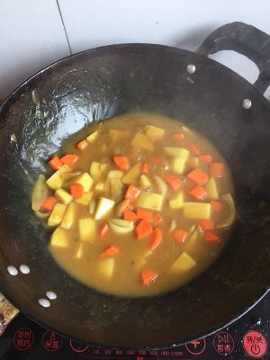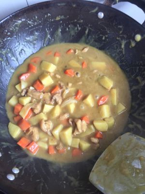 鸡肉少油翻炒半生熟,起锅。将洋葱炒香,再放入土豆和红萝卜翻炒片刻,加入高汤。记得先焖一下不急着加咖喱块。