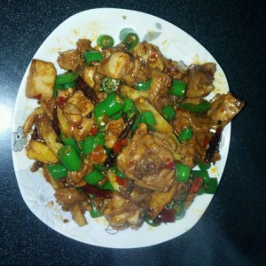 先下入辣椒干和花椒炒香,再放入大葱姜蒜炒香,加入豆瓣酱炒香,放入鸡块一起翻炒,直到鸡块炒熟再放入青椒,(青椒放早了会变色影响菜品效果)