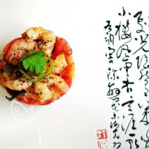 蕃茄去皮,虾肉切块,与蕃茄、木耳,用盐和柠檬醋拌匀