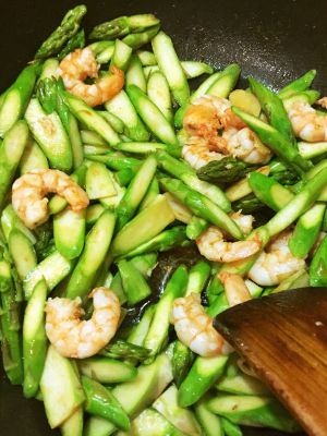 倒入之前超好的虾仁,撒入盐,生抽,继续翻炒至芦笋断生。这个过程不用很久,芦笋很容易熟,大约两三分钟。