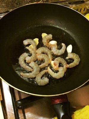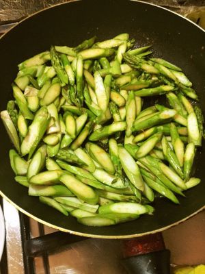 捞出虾头不要,倒入芦笋翻炒。