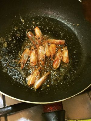 锅中加入油,多加一点,放入虾头,煎虾油。