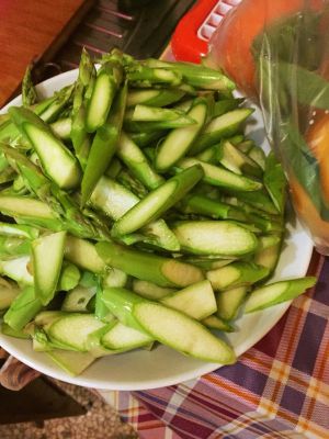 芦笋洗净,切片。