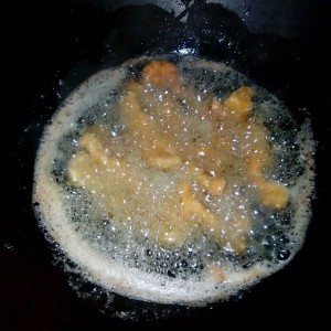 将用料酒,盐,姜,葱,蒜腌了15分钟的鸡排入锅炸至金黄色。