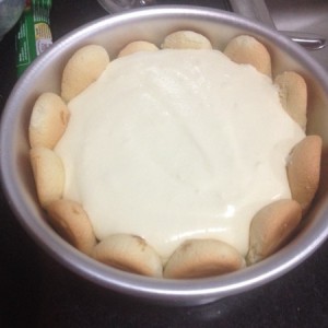 蛋糕6寸模中围一圈手指饼干,高低同模的高度一样,底部同样也铺上哈,将两勺力娇酒和咖啡粉拌匀刷在底部饼干上,将刚刚拌好的1倒入模中(可以放两层手指饼干,同样第二层也要刷咖啡酒)