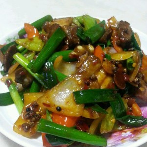 锅热加油倒入滕椒和干辣椒炒香后,加入姜蒜炒至蒜变金黄,加入一勺郫县豆瓣酱炒香炒出红油,加入洋葱和青红椒翻炒再放入酱油,耗油,料酒