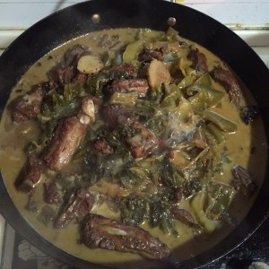然后锅里放油和辣椒把排骨翻炒,然后放水和酸菜