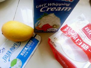 准备材料,其中芒果不要选太熟的,做出来口感不好,选稍偏生,带点酸的更好,冰冻之后反而甜