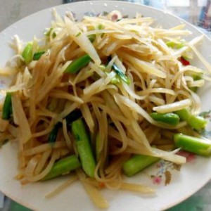 3.热锅凉油,下入干红椒、葱花、蒜片爆香,然后放入菠菜菜根和土豆丝,大火翻炒、掂匀。土豆丝稍变色,放入调配好的汁。最后放入盐,翻炒几下则可出锅装盘食用。